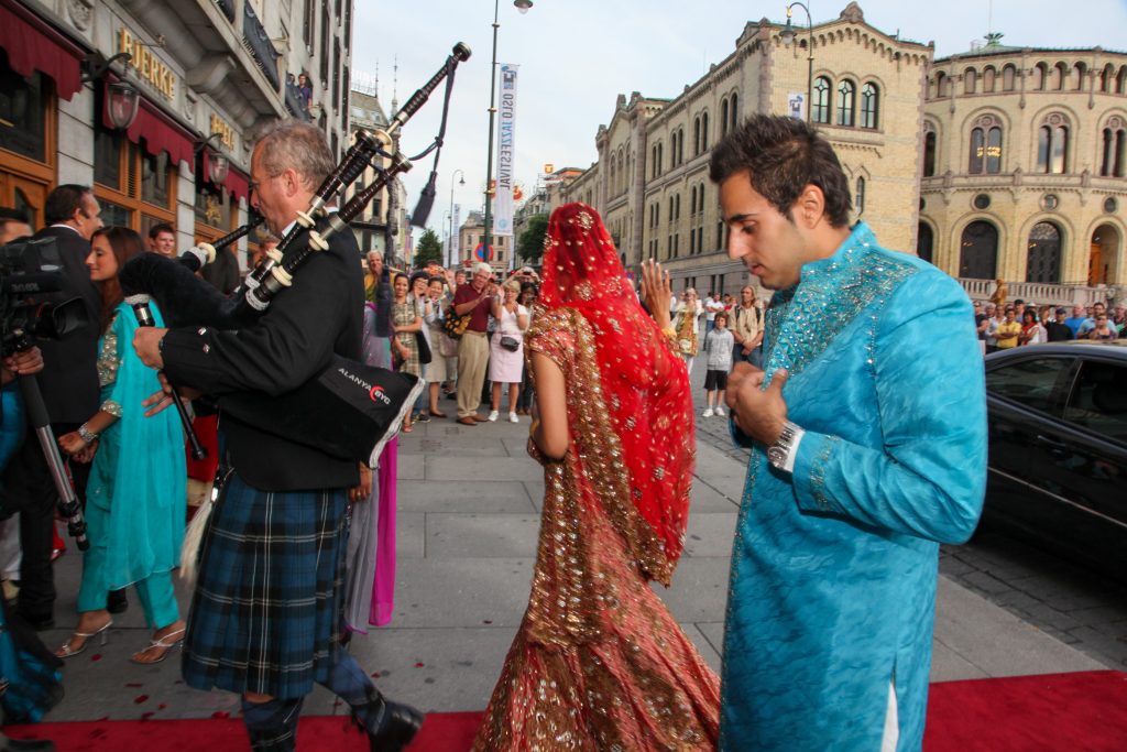 One of the most captivating moments was the arrival of the Baraat. The sheer scale of the celebration literally stopped traffic as both the Baraat and the bridal party were escorted to the venue. Surrounded by the sound of bagpipes and a cheering crowd, Neelam and Wassem made an entrance that Oslo will not soon forget. Actually, capturing that level of energy against such a classic backdrop is what makes destination photography so rewarding.